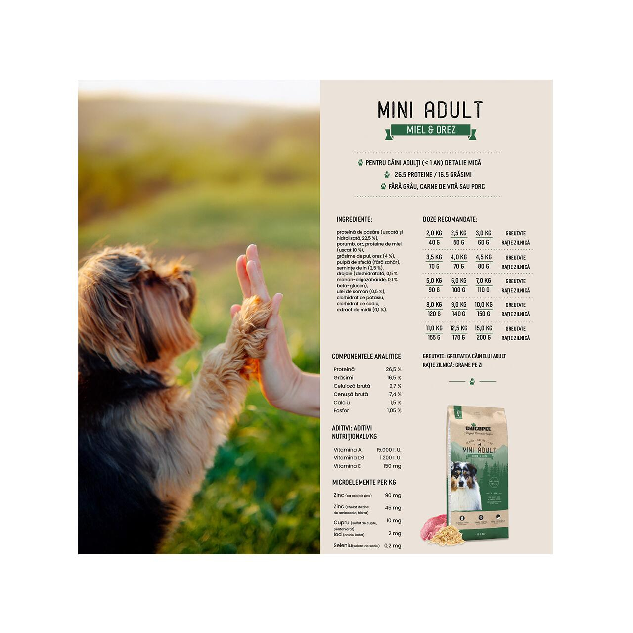 Hrană super premium Chicopee CNL Mini Adult (15kg). Formulă fără grâu pentru câini de talie mică, cu bobițe adaptate, suport pentru blană și controlul mirosului scaunului.