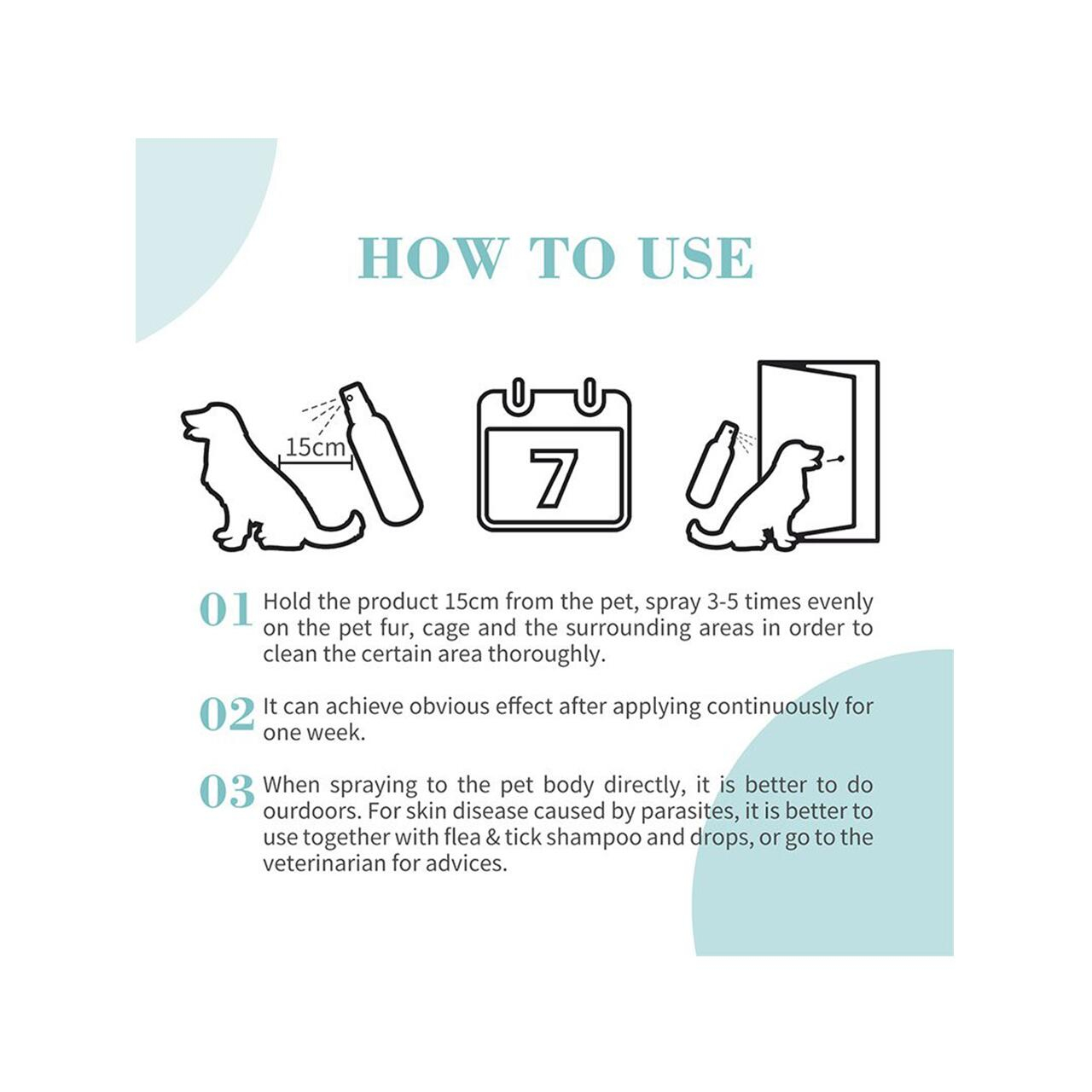Acest spray are în principal rol repelent (de respingere). Dacă există deja paraziți fixați, se recomandă utilizarea unui șampon de tratament sau a unei pipete urmată de spray pentru prevenție.