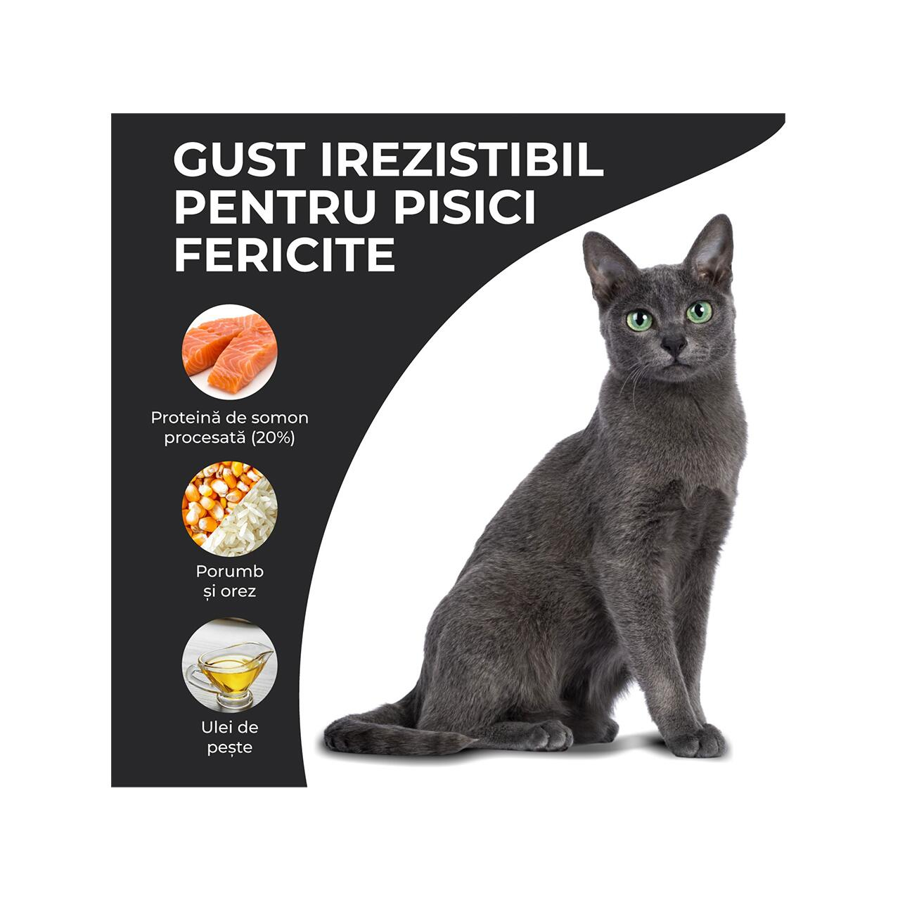 Pe lângă beneficiile estetice, formula este îmbogățită cu Biotină, Zinc și Vitamine din complexul B, elemente cheie în procesul de regenerare a keratinocitelor. Acest suport metabolic accelerează vindecarea micilor leziuni cutanate și previne descuamarea pielii (mătreața felină). Mai mult, prezența somonului asigură o palatabilitate excepțională, satisfăcând instinctele celor mai pretențioase feline care refuză sursele clasice de proteină, oferindu-le în același timp energia necesară pentru o viață activă.