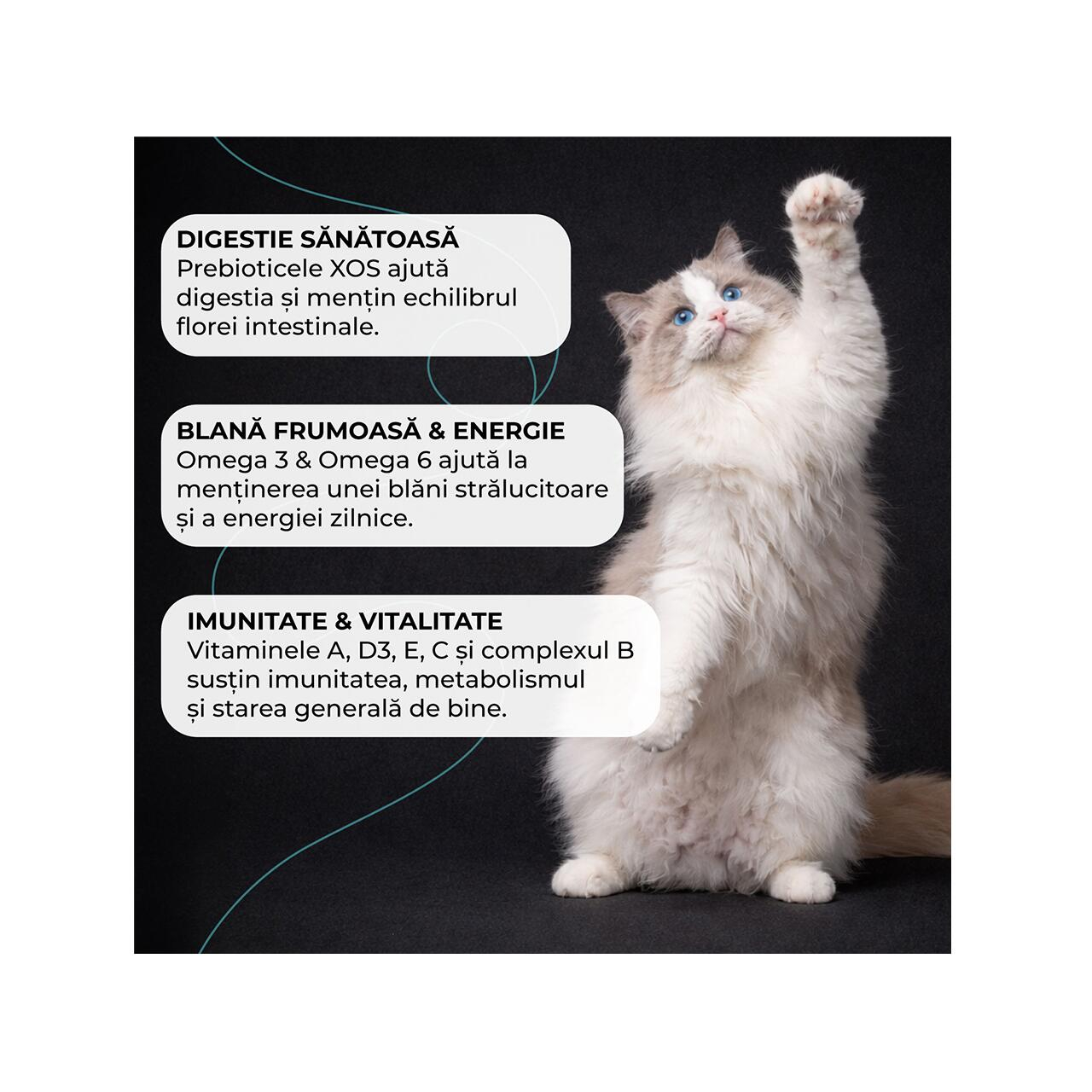 Secretul performanței gamei Skincare rezidă în concentrația optimizată de acizi grași esențiali Omega-3 și Omega-6. Acești nutrienți acționează la nivel celular, întărind „sigiliul” natural al pielii și reducând pierderea de umiditate transepidermică. Rezultatul este o piele hidratată, elastică și o blană care nu doar că strălucește, dar devine mult mai rezistentă la rupere și la formarea ghemelor de păr. Pentru proprietarii de pisici de expoziție sau de apartament, VIVO Skincare transformă toaletarea zilnică într-o dovadă de sănătate pură.